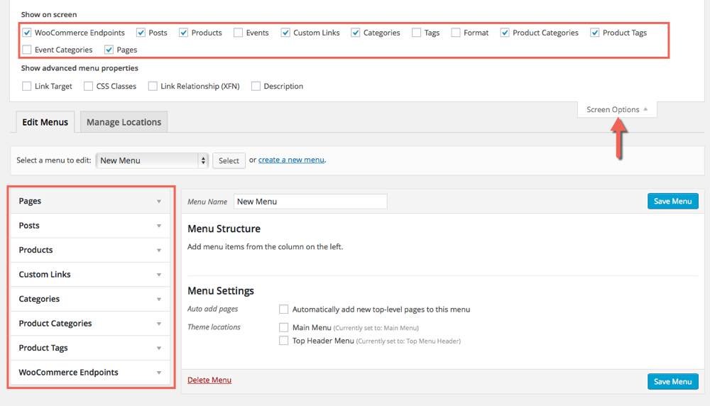 The Screen Options allow you to choose which items you can use to add to a menu. Certain items, like Posts or Products are hidden by default. The Screen Options are located in the top right corner of your WordPress dashboard.